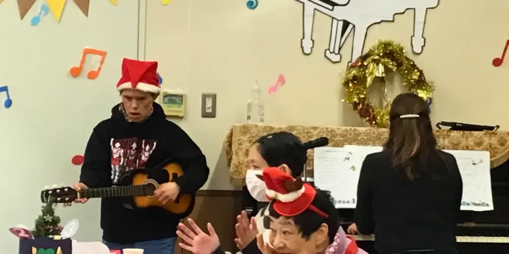 レクリエーションでは、音楽レクリエーションの「クリスマス版」を実施し、外部講師の先生による演奏や歌に合わせて、皆さん楽しそうに楽器を鳴らしたり手拍子をされたりしました。