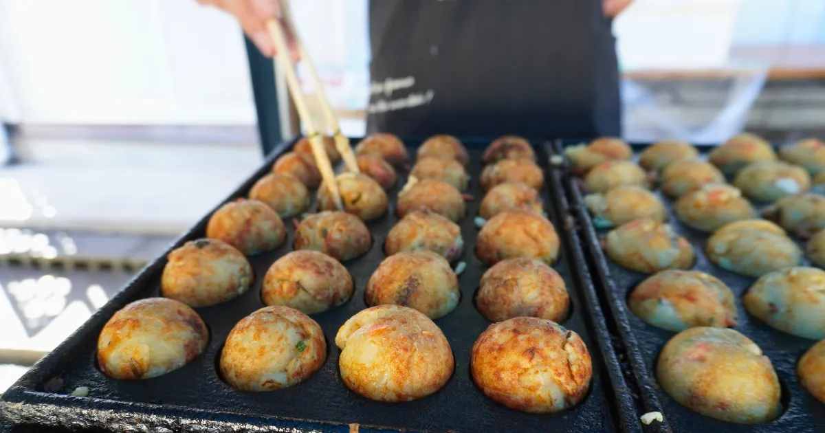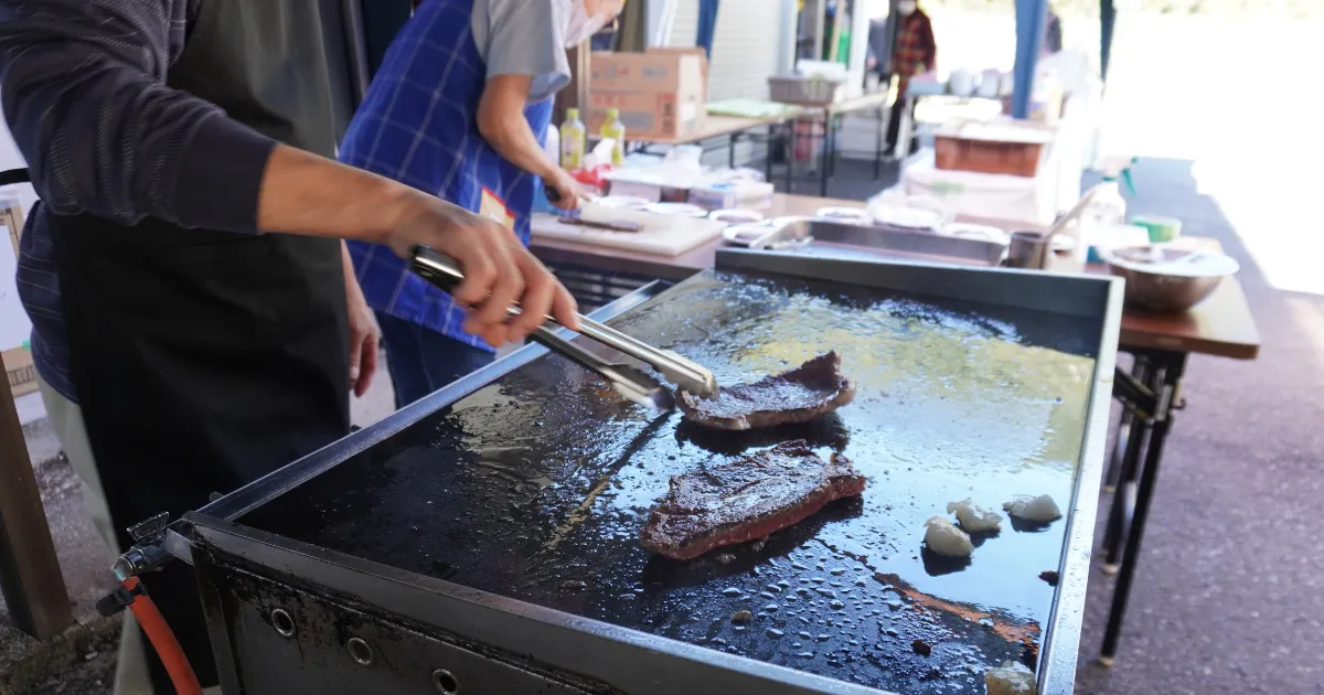 職員が焼くたこ焼きやステーキ、フライドポテトの香ばしい匂いが会場いっぱいに広がり、